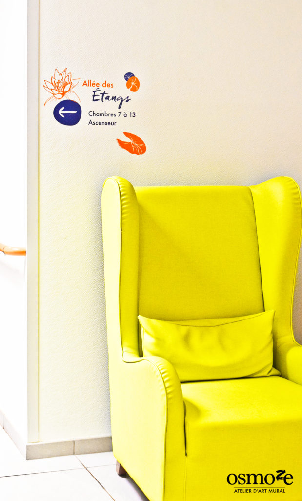 Les signalétiques décoratives aux intitulés poétiques se dessinent sur les murs entre nénuphars et fleurs pour guider les résidents dans une expérience au coeur du patrimoine ligérien.